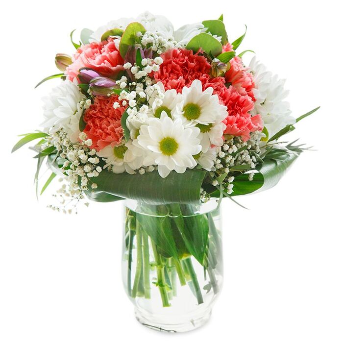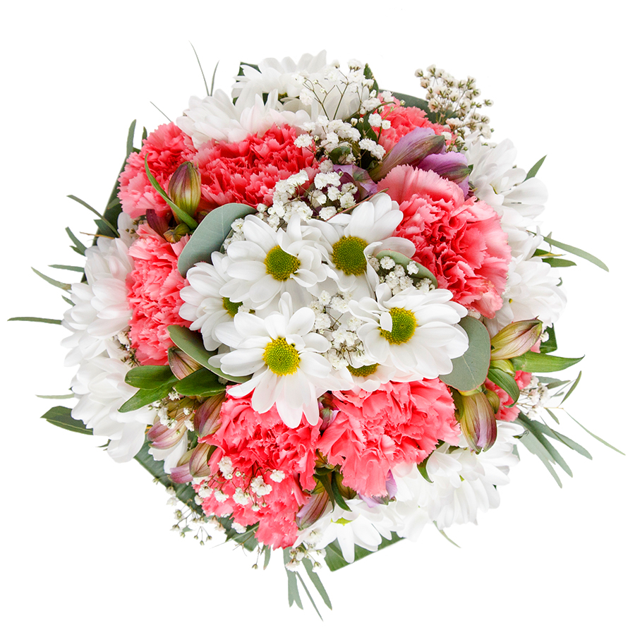 Immerse yourself in the beauty of our meticulously crafted bouquet, where every petal reflects a story of care and elegance. Our expert florists hand-select each bloom to ensure unmatched freshness and beauty lasting up to five days. With a soothing color palette that combines pristine white chrysanthemums, delicate gypsophila, soft pink carnations, and elegant aspidistra leaves, this bouquet is a work of art.